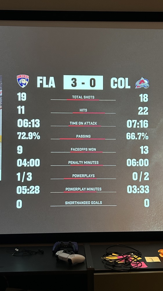 Florida Panthers (Julius) voitti Colorado Avalanchen (Jani) selvin lukemin 3–0 Mouhon virtuaaliliigan Henut-konferenssin runkosarjaottelussa. Ottelu pelattiin ilman jatkoaikaa tai voittolaukauskilpailua. Vaikka Avalanche vei sekä laukaukset (18–19) että aloitukset (13–9) ja hallitsi enemmän kiekkoa (7:16 vs. 6:13), Panthers oli tehokkaampi hyödyntäen paikkansa paremmin. Ottelussa nähtiin yhteensä 33 taklausta ja 10 rangaistusminuuttia. Voitolla Julius nosti Elo-pisteitään 13:lla (1480), kun taas Jani menetti saman verran (1308).