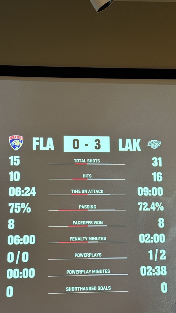 Los Angeles Kingsin Ville voitti Florida Panthersin Juliuksen 3–0 selkeällä esityksellä. Ville hallitsi peliä laukauksissa 31–15, taklauksissa 16–10 ja hyökkäysajassa 2,5 minuuttia enemmän. Syöttöprosentti Villellä 72,4 %, Julius hieman parempi 75,0 %. Rangaistuksia Julius otti kolme kertaa enemmän (6 min vs 2 min). Ville nousi konferenssissa sijalta 4 sijalle 2 ja turnauksessa sijalta 12 sijalle 9, kun taas Julius jatkaa tappioputkessa (4/5 viimeisestä pelistä hävit
