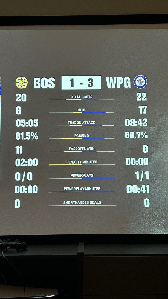 Mouhon virtuaalisessa jääkiekkoliigassa pelattiin ottelu Winnipeg Jetsin ja Boston Bruinsin välillä 28. lokakuuta 2025. Jets, jonka edustaja oli Jaakko, voitti pelin maalein 3-1 Bruinsia vastaan, jota edusti Konsta. Jets hallitsi peliä tehokkaammin, laukoen 22 kertaa ja halliten kiekkoa yli kolme minuuttia pidempään kuin Bruins. He myös taklasivat enemmän ja voittivat useammin kaksinkamppailuja, vaikka hävisivät aloituksissa. Tämän voiton myötä Jaakon edustama Jets nousi Elo-rankingissa 21 pistettä, kun taas Konstan Bruins laski saman verran.