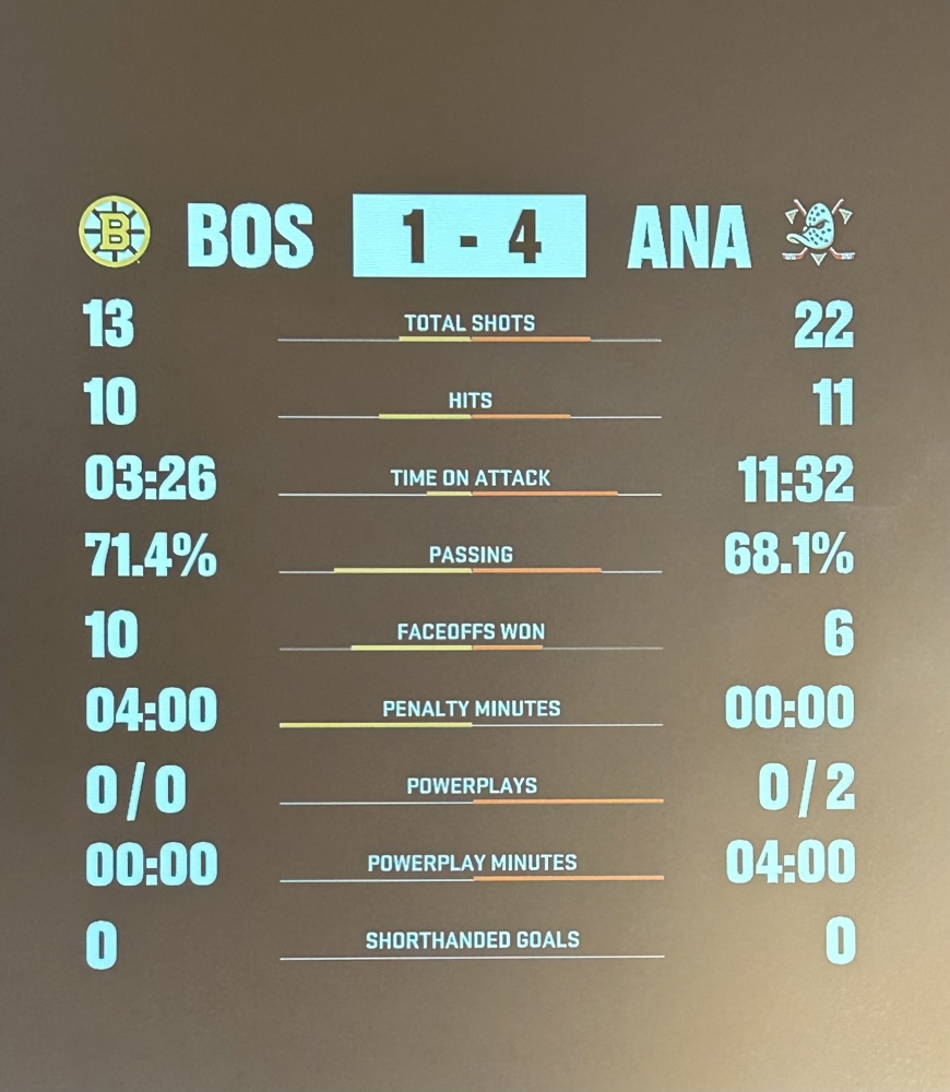 Anaheim Ducks (Mikko) voitti Boston Bruinsin (Konsta) selvin numeroin 4–1 Mouhon virtuaalisen jääkiekkoliigan Juntit-konferenssin runkosarjaottelussa 28.11.2025. Ducks hallitsi peliä selvästi, laukoi enemmän (22–13) ja piti kiekkoa pitkään (11:32 vs 3:26). Bruins voitti aloitukset (10–6), mutta Ducks vei voiton ilman jatkoaikaa. Mikko sai voitosta 16 Elo-pistettä, Konstan saldo laski saman verran.