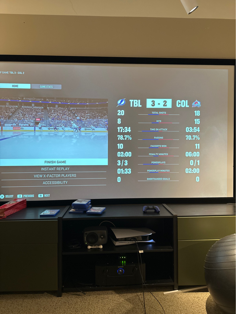 Tampa Bay Lightning (Joel) voitti Colorado Avalanchen (Jani) maalein 3–2 Mouhon virtuaaliliigan Henut-konferenssin runkosarjaottelussa 9.12.2025. Ottelussa ei nähty jatkoaikaa eikä voittolaukauksia. Tampa Bay hallitsi kiekkoa selvästi (hyökkäysaika 17:34 vs. 3:54) ja syöttöprosentti oli korkeampi (78,7 % vs. 70,7 %). Colorado oli fyysisempi (15 taklausta vs. 8) ja otti enemmän jäähyjä. Tampa Bayn voitto nosti Joelin Elo-lukua kuudella pisteellä (1571), Janin Elo laski kuudella (1288).