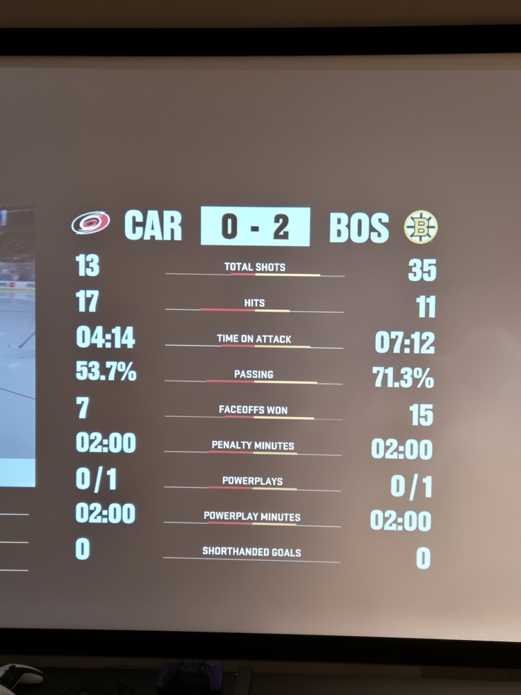 Mouho 2026 -liigan Juntit-konferenssin ottelussa Boston Bruins (Konsta) voitti Carolina Hurricanesin (Tuomo) maalein 2–0. Ottelu pelattiin ilman jatkoaikaa tai voittolaukauskilpailua. Boston hallitsi peliä selvästi: laukaukset 35–13, kiekonhallinta 7:12 vs. 4:14 sekä aloitukset 15–7. Hurricanes taklasi enemmän (17 vs. 11), mutta jäi tehottomaksi hyökkäyksessä. Molemmat joukkueet ottivat kaksi minuuttia jäähyjä. Voitolla Konsta nosti ELO-pisteitään 24:llä.