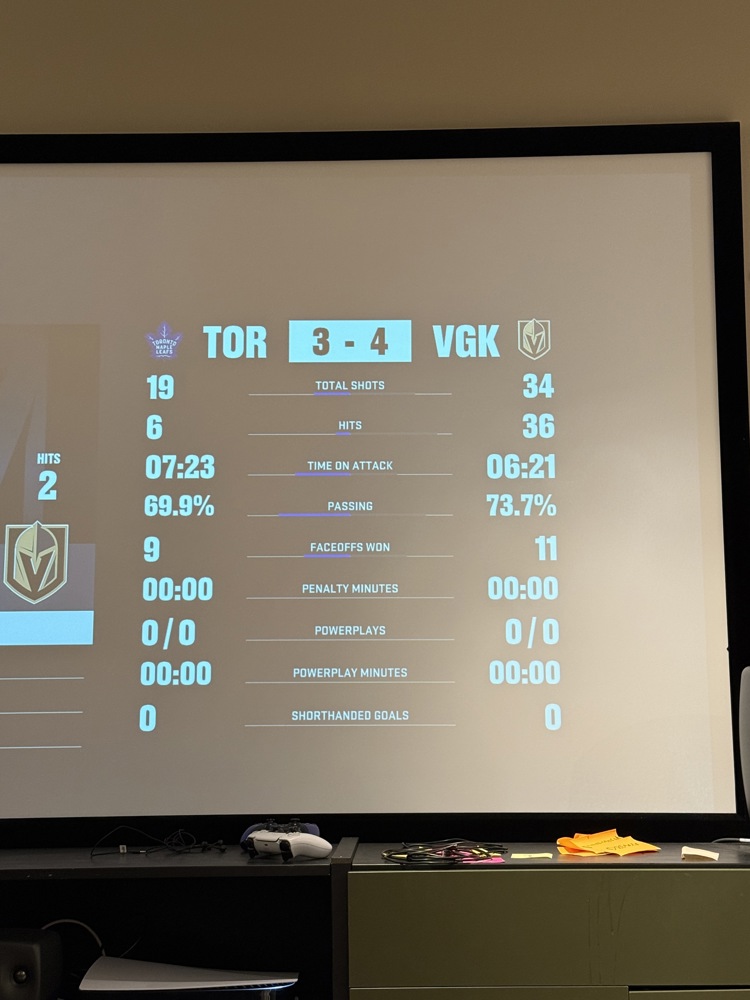 Vegas Golden Knights (Matias) voitti Toronto Maple Leafsin (Rasmus) tiukassa ottelussa jatkoajalla numeroin 4–3 Mouhon virtuaaliliigan Tammisen Pekat -konferenssissa. Vegas hallitsi ottelua laukauksissa (34–19) ja taklauksissa (36–6), mutta Toronto oli hieman pidempään hyökkäysalueella. Voiton myötä Vegasin Elo-rating nousi viidellä pisteellä (1719), kun Toronton rating laski saman verran (1387).